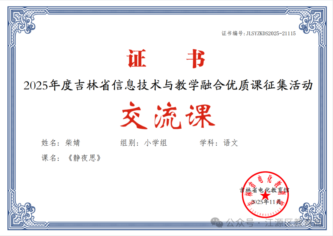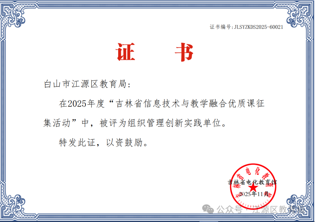 在近日结束的2025年度“吉林省信息技术与教学融合优质课征集活动”中,江源区教育系统教师团队展现出了卓越的教学创新能力与信息技术应用水平,凭借精心设计的教学活动与信息技术应用深度融合,最终在省级评审中脱颖而出。