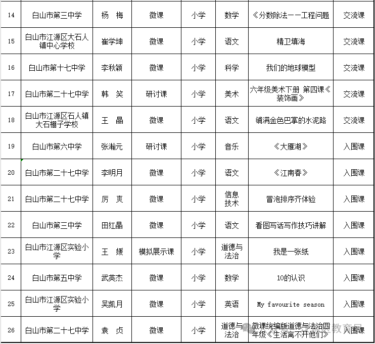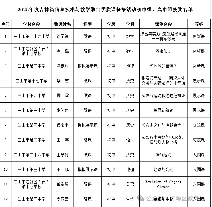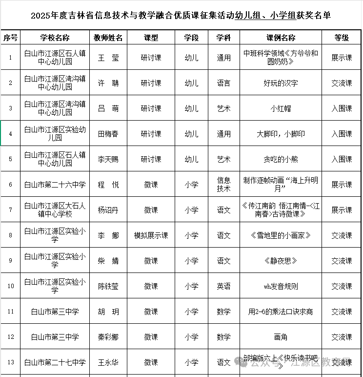 活动中,白山市江源区教育局被评为“组织管理创新实践单位”;共有47名教师在“创新课”、“展示课”、“交流课”、“入围课”评选中获得了省级荣誉。